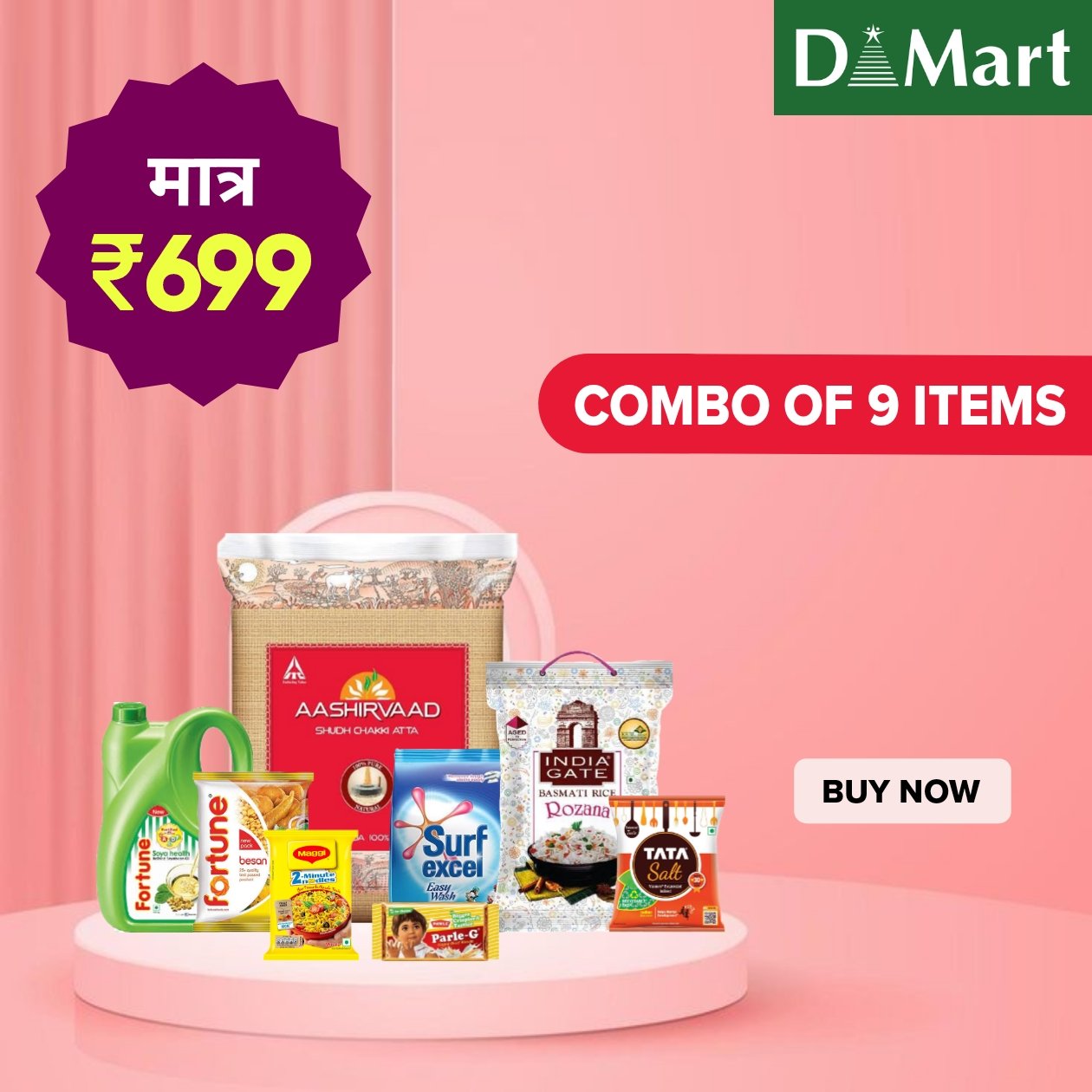 DMart Offer Today 9 Combo packs ' 10 kg Ashirwaad atta , 5 kg india gate basmati rice , fortune oil 5 L , Surf Excel 5 kg and more 5Kg