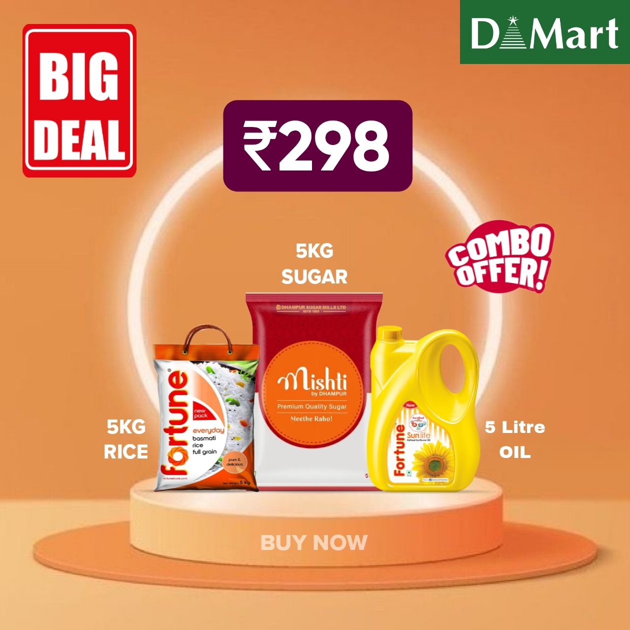 DMart Offer Today: Combo of 5 kg Fortune oil+ 5 kg sugar+ 5 kg Basmati rice